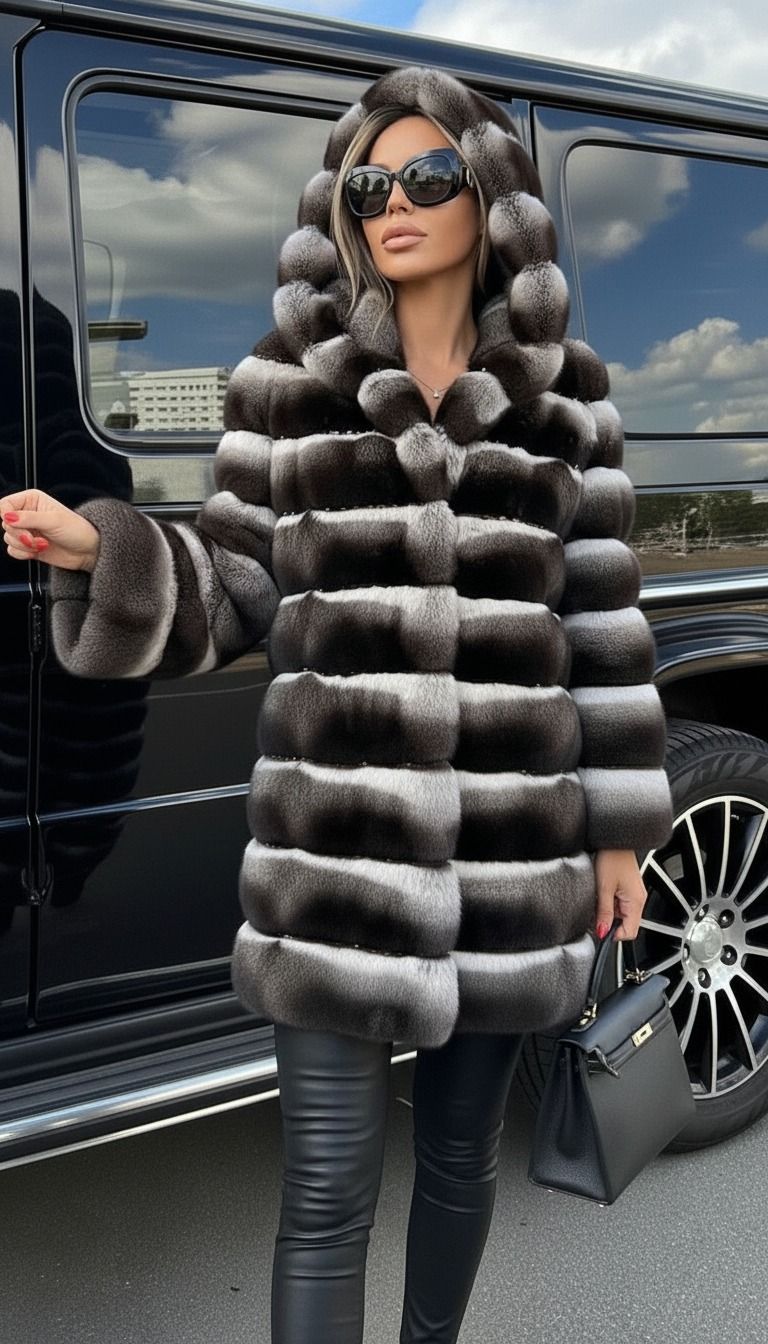 Blouson di Chinchilla black velvet con Cappuccio lunghezza cm 70