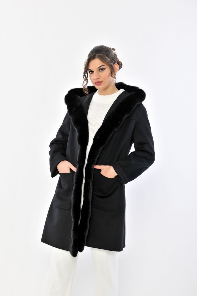 Cappotto cashmere nero con cappuccio e paramontura frontale in visone nero, sfoderato. In tessuto Loro Piana. Allacciatura centrale con cintura. Con due tasche laterali a toppa.