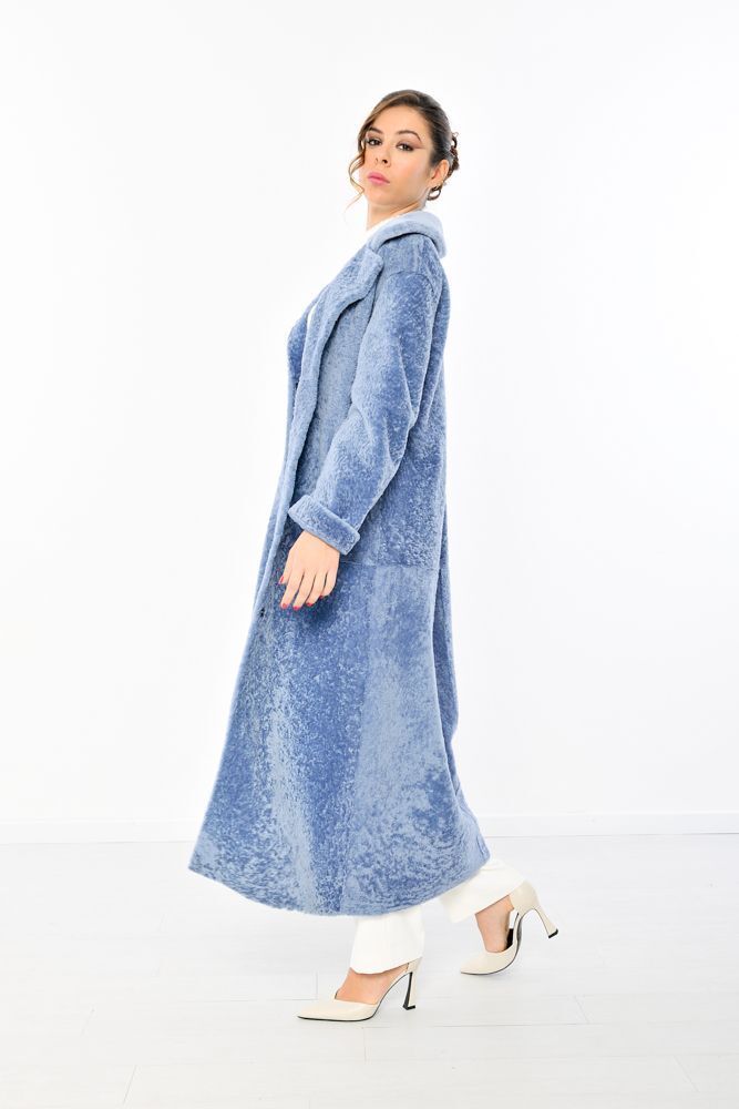 Caldo cappotto in montone shearling reversibile con interno nappato color jeans. Il cappotto presenta un collo a uomo e un' allacciatura centrale con automatici a scomparsa e cintura in vita.