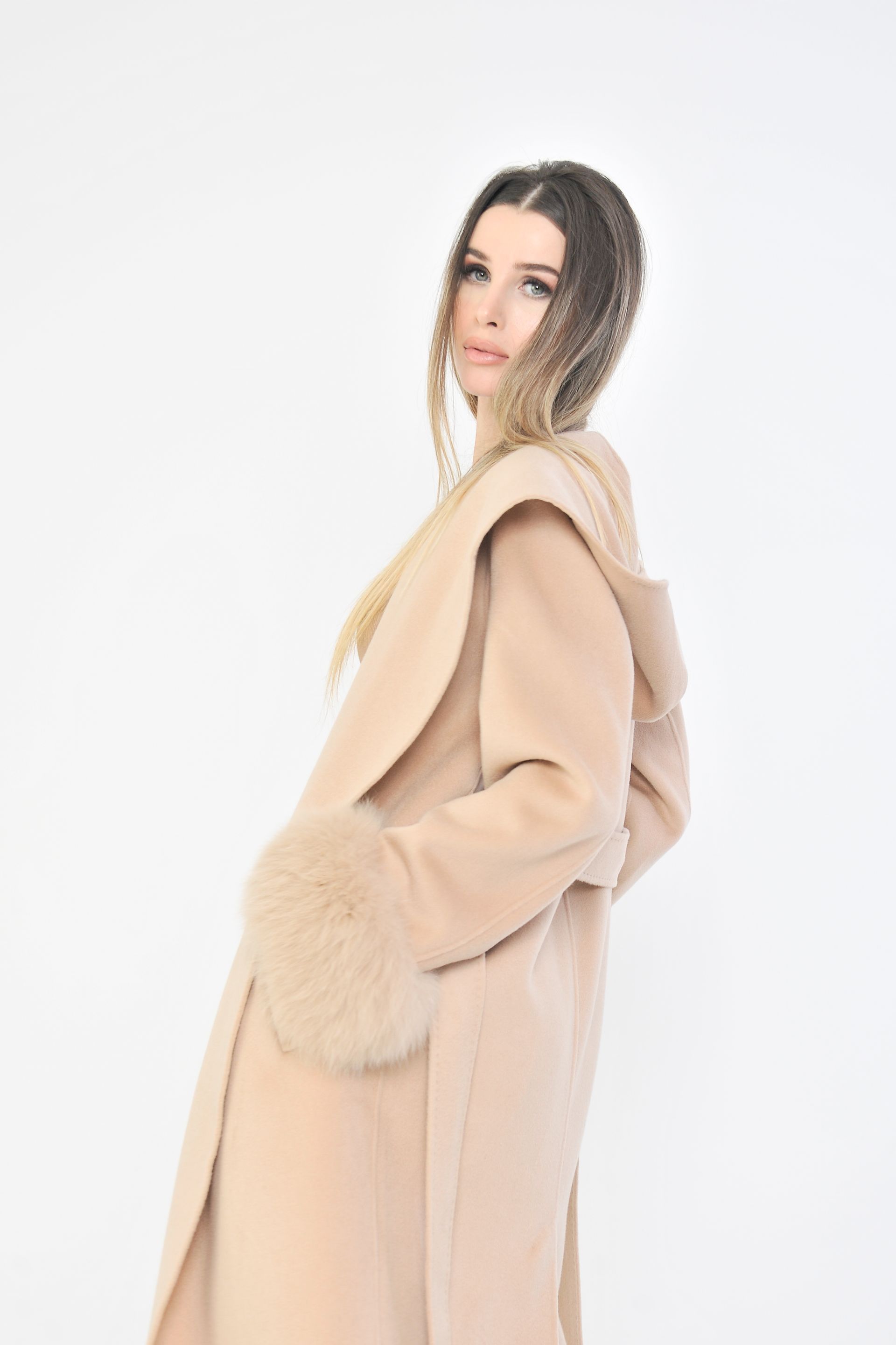 Cappotto in tessuto color camel con cappuccio. I polsi sono bordati in volpe staccabile, con due tasche verticali e chiusura con cintura in tessuto in vita . Il cappotto presenta uno spacco verticale posteriore .