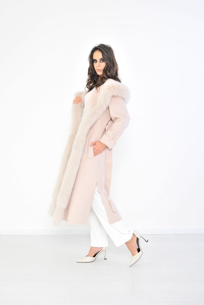 Cappotto intessuto sfoderato color cipria con cappuccio e paramontura frontale bordata in volpe tono su tono. Con chiusura a cintura in tessuto cipria in vita, con due spacchi laterali.