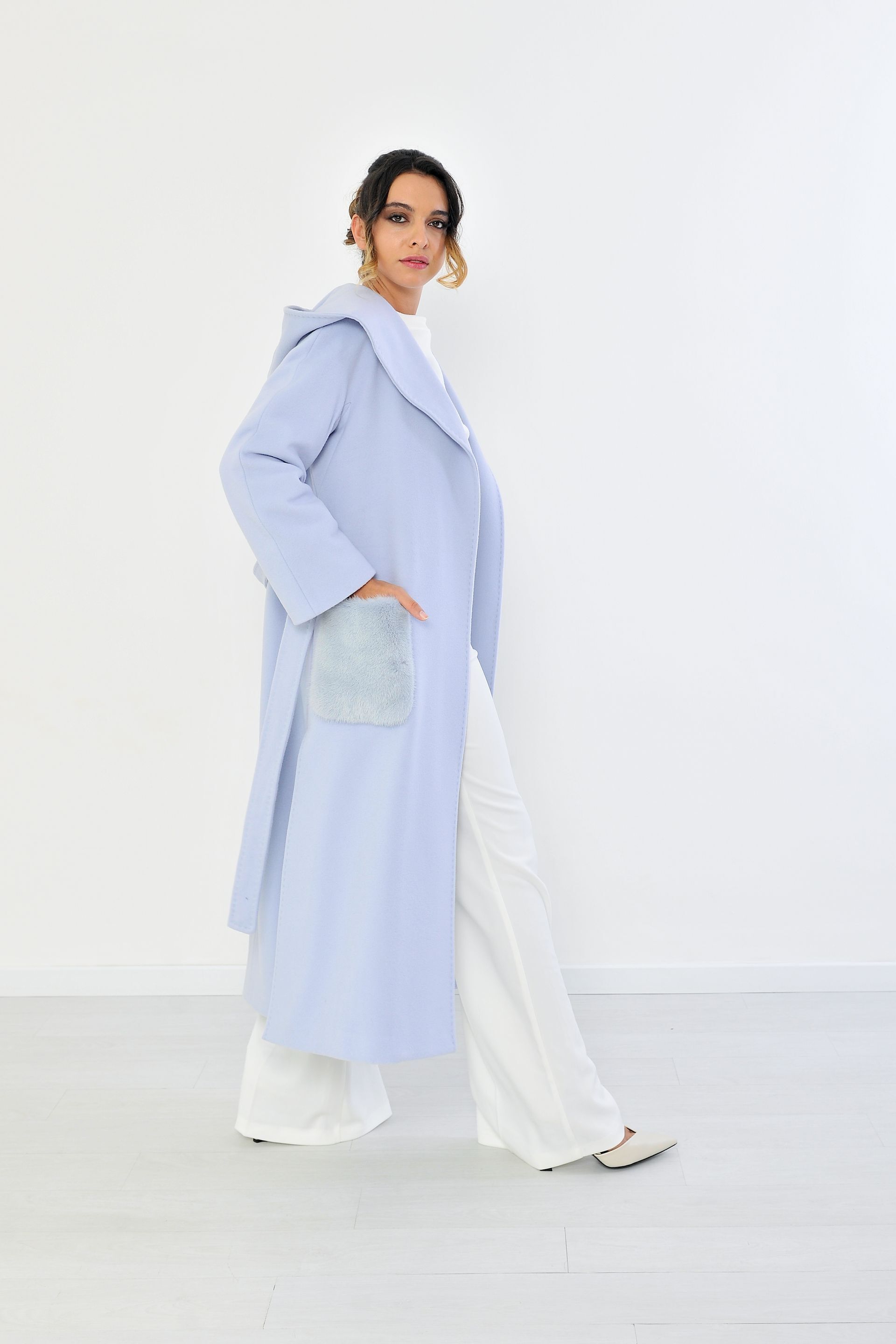 Cappotto lungo con cappuccio con tasche in visone, cappuccio e profondi spacchi laterali. Allacciatura centrale con cintura