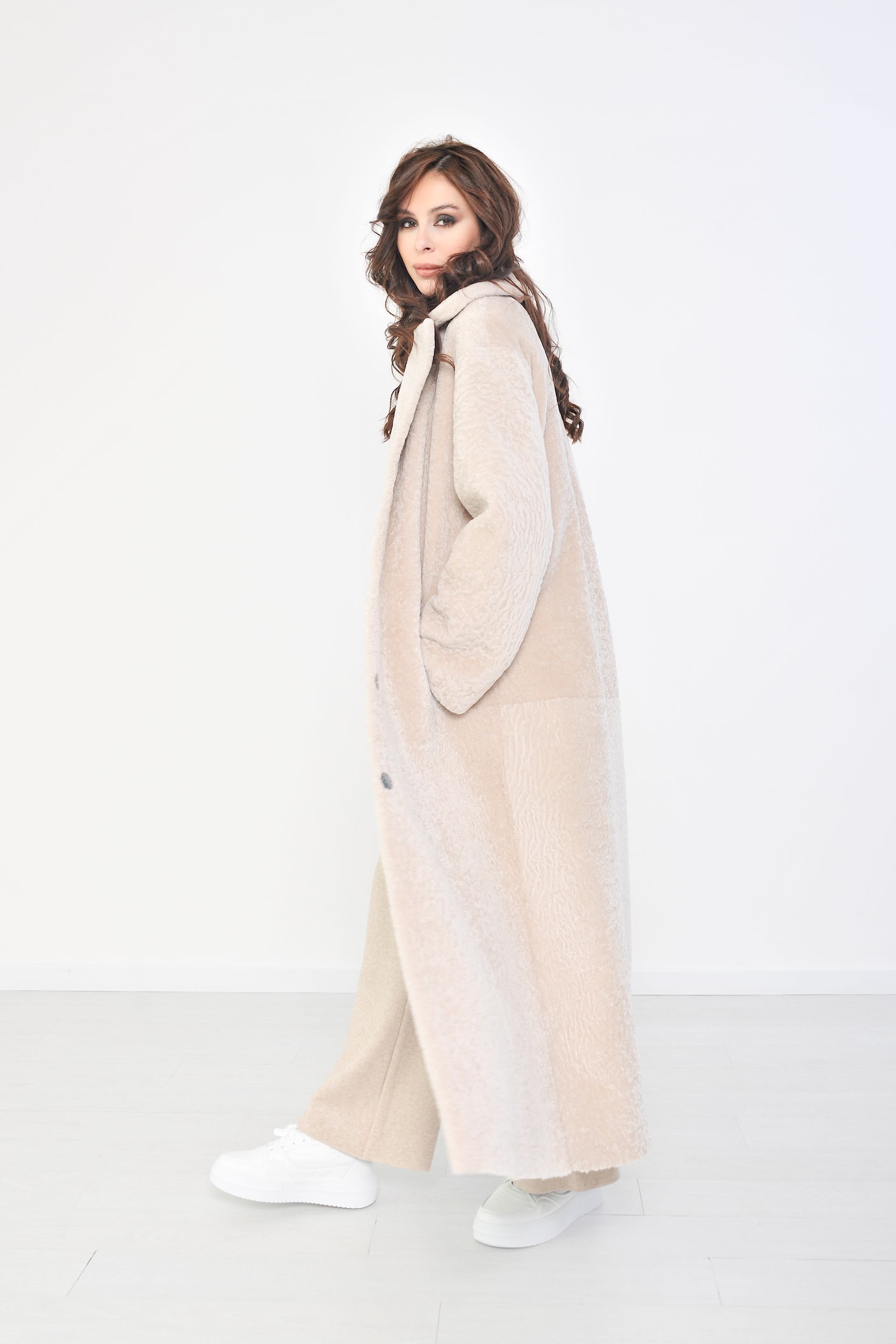 Cappotto montone shearling reversibile con collo a revers. Interno nappato grigio perla . Allacciatura con automatici a scomparsa e cintura . Tasche verticali. Vestibilità comoda. Lunghezza cm 130.