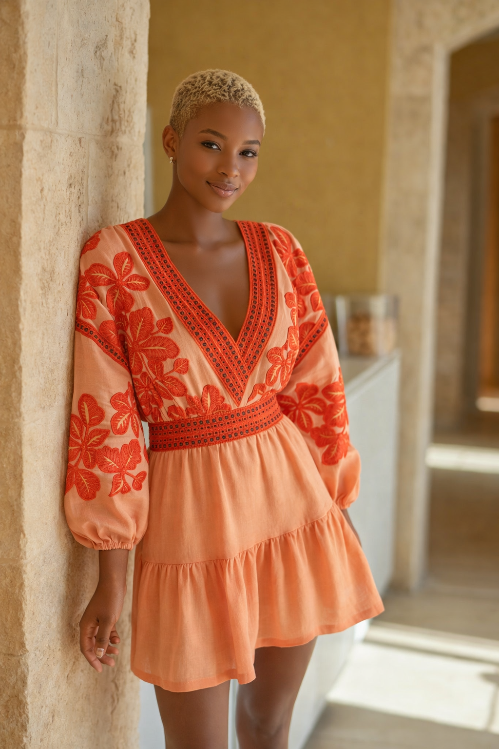 La tonalità arancione vivace cattura l'energia del sole estivo, mentre i delicati ricami floreali in un contrasto di colori conferiscono un tocco di femminilità romantica e artigianale. La silhouette fluida e ariosa, con la sua vita accentuata da un nastro ricamato e la gonna a balze, garantisce una sensazione di leggerezza e comfort impeccabile.