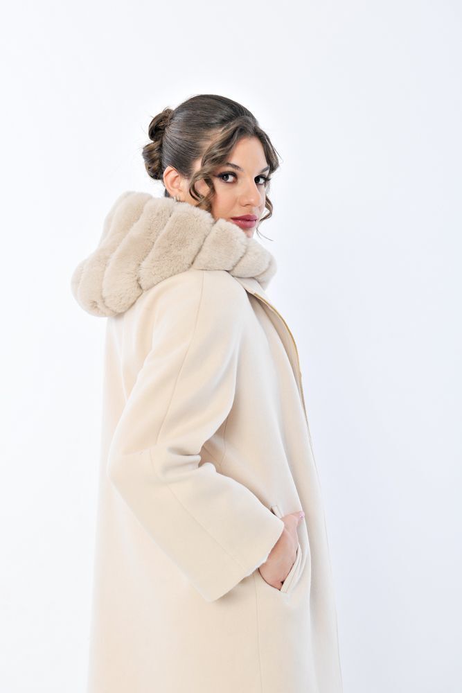 Giaccone in misto cashmere con frontale in castorex staccabile modello con cappuccio bordato in castorex. Interno fodera tono su tono.
