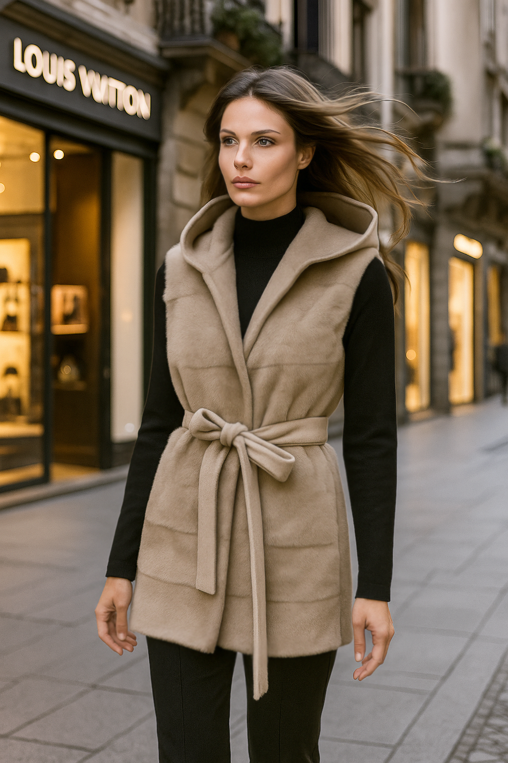 Gilet in cashmere doppio colore, sfoderato, con cappuccio e frontale in visone.